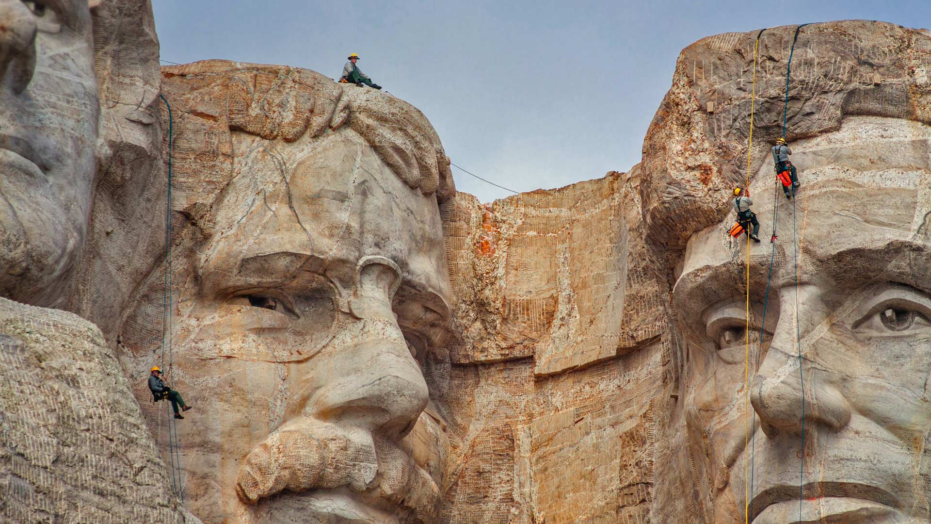 Park service employees inspecting Mount Rushmore National Memorial