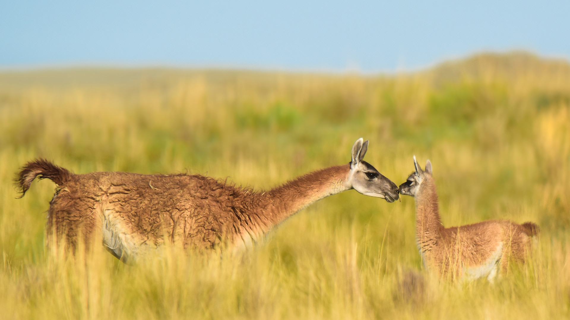 Guanaco mother and newborn baby in grassland, La Pampa Province, 阿根廷 (© Gabriel Rojo/Minden Pictures)